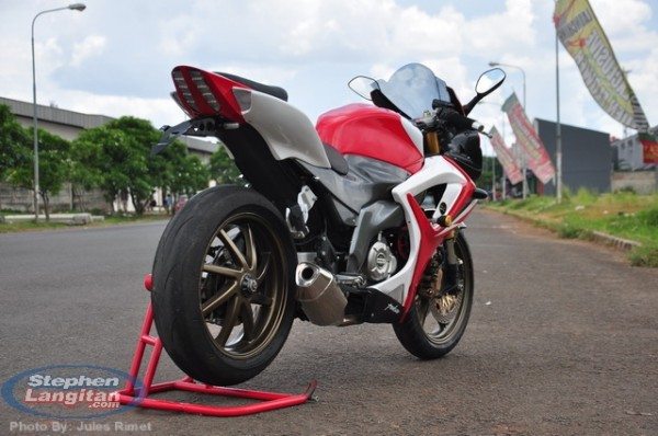 The modified Rouser 220 that you see here is built on an Aprilia Deltabox frame. The fairing, fuel tank and most of the body panels seem to have been taken from a 600 cc Gixxer. The fairing supports the same old headlamp and while the front-look might not be to everyone’s taste, the front end of the bike looks absolutely stunning when viewed in profile. Oh, and the Bugs Bunny ears continue to perform the duty of RVMs. The front section also gets upside-down forks from the R6 along with the R6 front disc brakes. The 17 inch rims and the swingarm seem to have been donated by a Honda RVF400. The rims come wearing Michelin rubber, with the front getting 120/70 and rear getting 180/55 spec footwear.